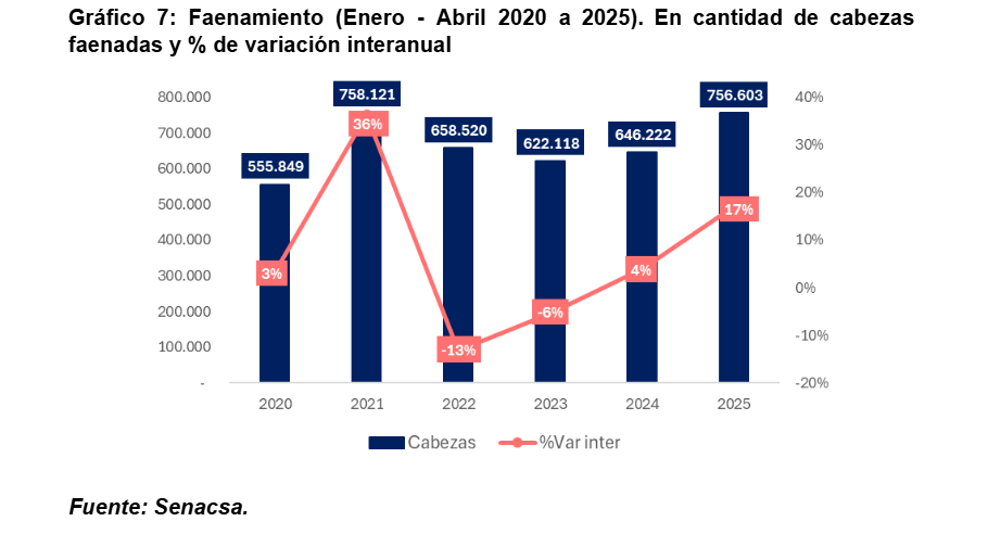 No obstante, en términos acumulados, el volumen de cabezas faenadas alcanzó las 756.603 unidades, lo que representa un incremento del 17% en comparación con el mismo periodo de 2024 (646.222 cabezas), reflejando una dinámica positiva en la actividad ganadera durante el primer cuatrimestre del año.