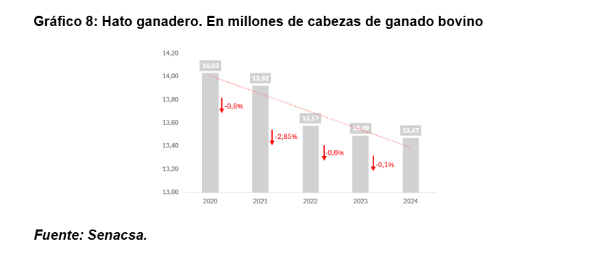 El sector ganadero estableció un récord de producción en 2024, impulsado por la apertura de nuevos mercados y condiciones climáticas favorables. De igual forma el faenamiento en el primer cuatrimestre de 2025 presenta un crecimiento del 17%. En el 2024 se produjo una contracción del hato ganadero y de los tenedores bovinos.