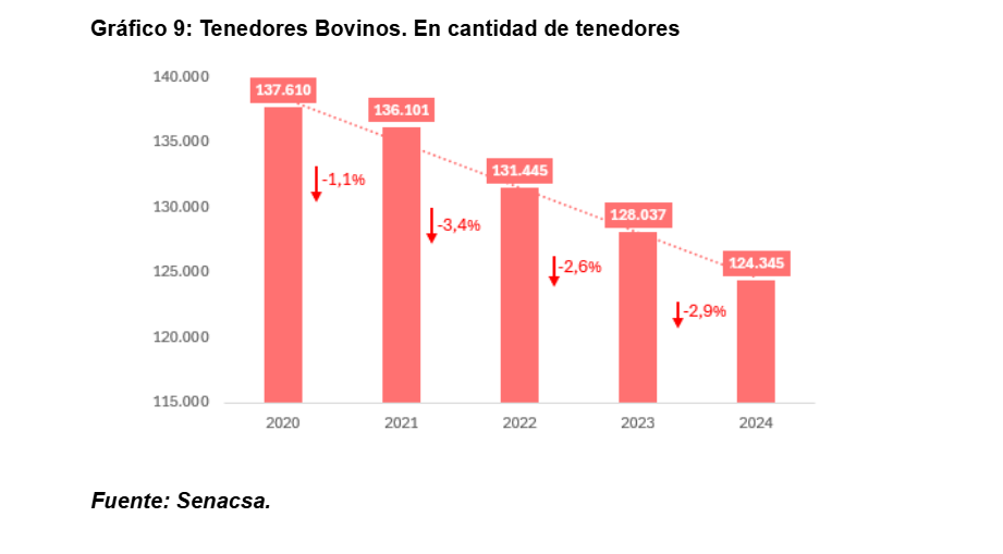 No obstante, el número de tenedores bovinos continuó su tendencia descendente por cuarto año consecutivo, con una contracción del 2,9%, al pasar de 128.037 en 2023 a 124.345 en 2024.