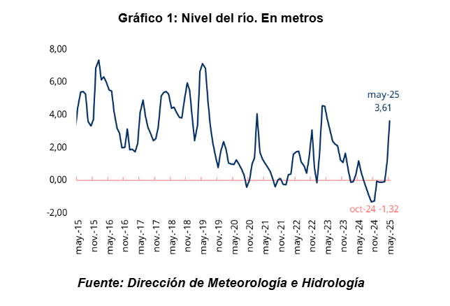 La situación del nivel del río presentó mejoras desde abril 2025, llegando a 3,6 metros sobre el cero hidrométrico en mayo 2025, frente al 1,2 metros registrado en mayo 2024.