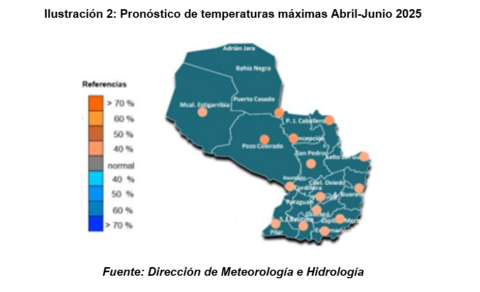 Si bien en la Región Oriental se esperan precipitaciones por debajo del nivel típico, el pronóstico no se aleja en exceso de lo normal y no se llegaría a situaciones extremas que conlleven a sequía. Para la parte Occidental del país se esperan condiciones normales de precipitaciones durante el trimestre de abril-junio 2025, especialmente favorable para la ganadería que predomina la región.