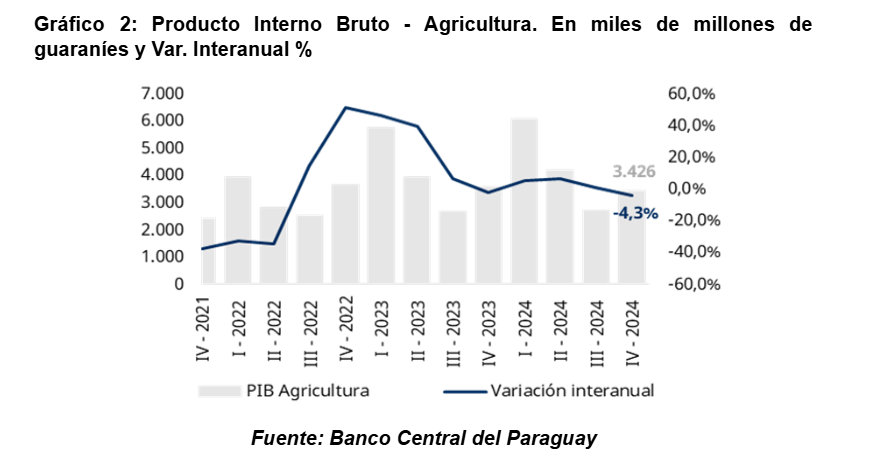 Al cierre del cuarto trimestre de 2024 el PIB agrícola registró una contracción interanual de 4,3%. A pesar de este descenso en el último trimestre, el sector agrícola logró cerrar el año con un crecimiento acumulado de 2,78%