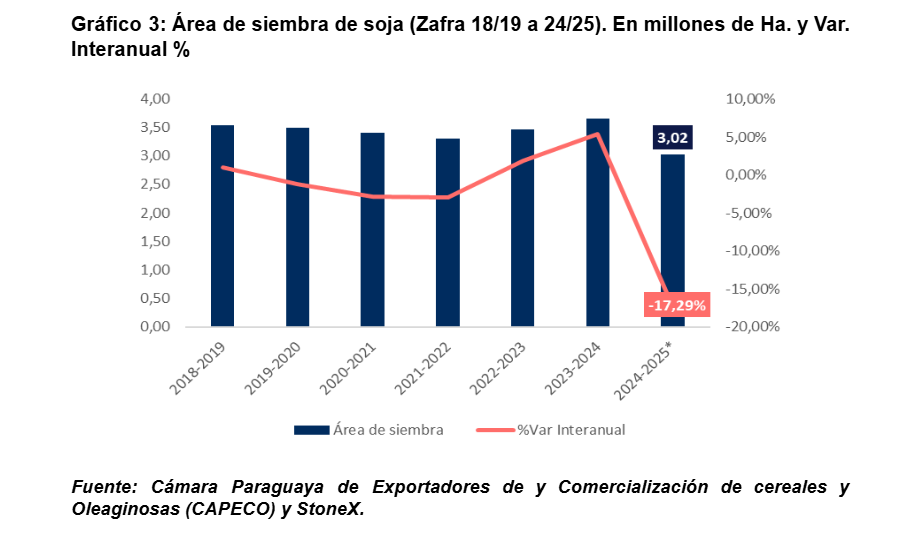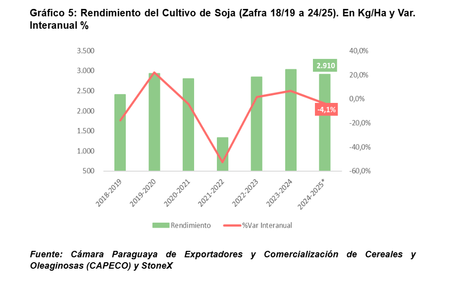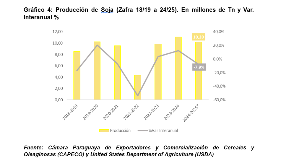 Según datos de la CAPECO, la producción de soja alcanzó 11,07 millones de toneladas lo cual representó un crecimiento del 12,3% con respecto a la campaña anterior. El área de siembra alcanzó 3,46 millones de has y el rendimiento de la producción estuvo en torno a 3.034 kgs/ha que representó un crecimiento del 6,6%. La campaña sojera 2024/25 se desarrolla en un contexto complejo caracterizado por escenario climáticos adversos en las diversas zonas productivas del país.