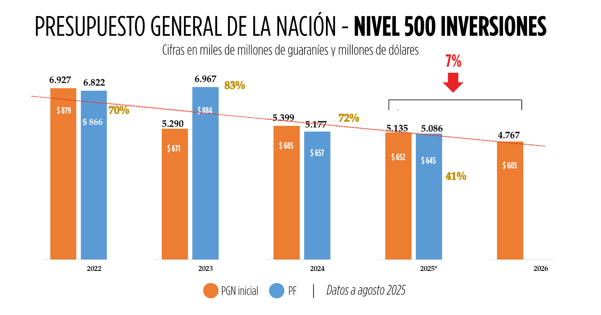 En lo que respecta a la inversión pública, se prevé una asignación de G. 4,7 billones, alrededor de USD 605 millones, lo que representa una reducción del 7% en comparación con los USD 645 millones del ejercicio actual. En términos absolutos, se trata de casi USD 50 millones menos destinados a obras.