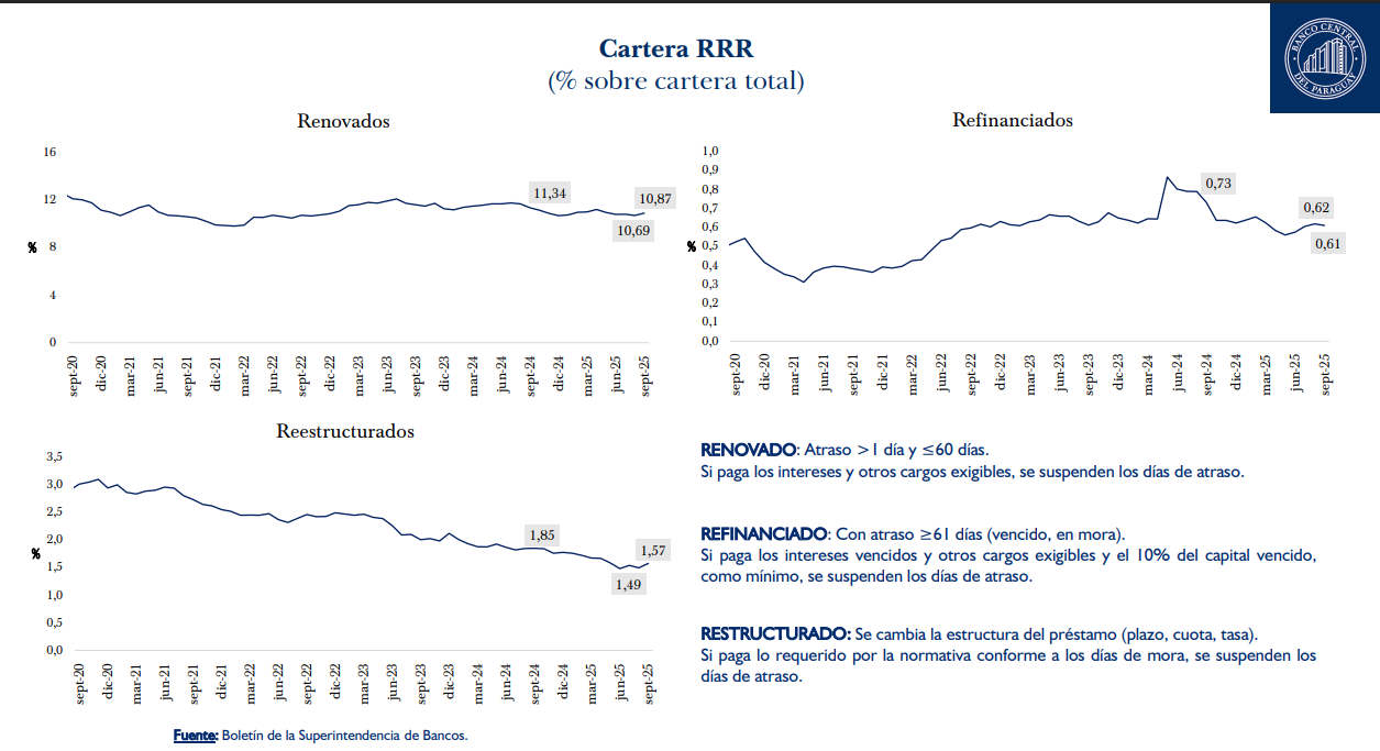 El crédito en Paraguay continúa mostrando un crecimiento sostenido al cierre del tercer trimestre del año, impulsado por el dinamismo económico y la expansión del financiamiento tanto a empresas como a personas. Sin embargo, junto con este incremento también se observa un aumento en otras carteras, como la de morosidad y la denominada cartera RRR (renovados, reestructurados y refinanciados), según detalla el informe de Indicadores Financieros elaborado por el Banco Central del Paraguay (BCP).