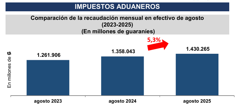 Del total, la gerencia general de Aduanas alcanzó una recaudación en efectivo de G. 1,4 billones (USD 195,2 millones) en el mes de agosto, una variación interanual de 5,3% respecto al mismo mes del año anterior, equivalente a G. 72.222 millones (USD 9,9 millones) más.