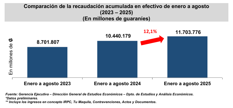 En el mes de agosto, la DNIT recaudó G. 3 billones (USD 415,3 millones), lo cual representa un crecimiento de 12,9% en comparación al mismo mes del año 2024, obteniendo G. 348.030 millones más (USD 47,5 millones).