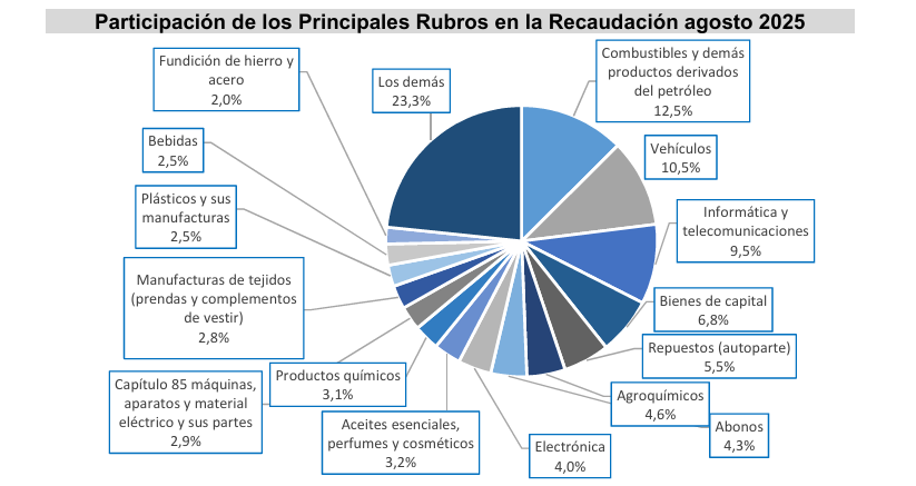 Cabe resaltar que la recaudación aduanera correspondiente al mes de agosto de 2025 muestra una marcada concentración principalmente entre los rubros de combustibles y demás productos derivados del petróleo con un 12,5% de participación en el total, lo que equivale a unos G. 178.783 millones.