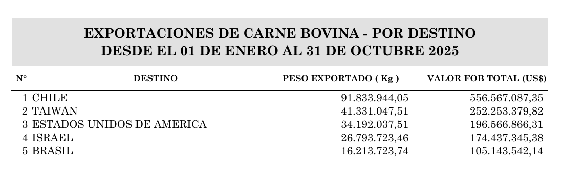 Entre los principales destinos de la carne bovina paraguaya se encuentran Chile, Taiwán, Estados Unidos, Israel y Brasil. Chile sigue siendo el principal receptor de la proteína roja y hasta octubre de 2025 acapara el 31% de todos los envíos realizados por nuestro país, alcanzando un total de USD 556,5 millones.