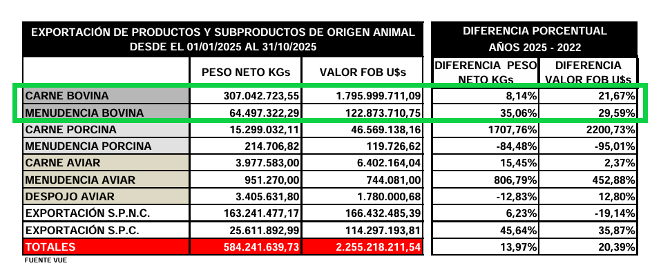 De enero a octubre de 2025, Paraguay exportó un total de 371.540 toneladas de carne y menudencia bovina por un importe total de USD 1.918,8 millones. En relación con el mismo periodo del 2024, se observa un incremento del 28,8% en el valor de las exportaciones de la proteína bovina y sus menudencias, mientras que en cuanto al volumen, el aumento es del 11,5%.
