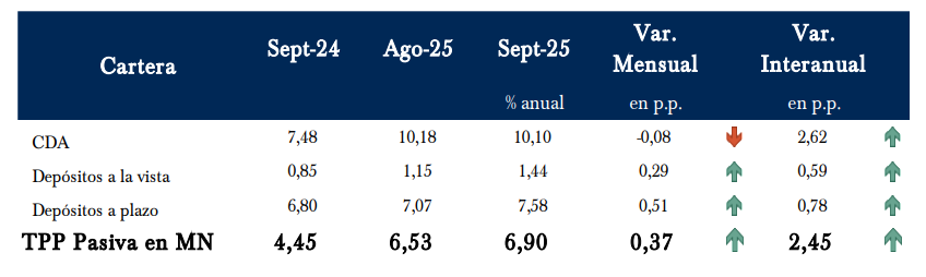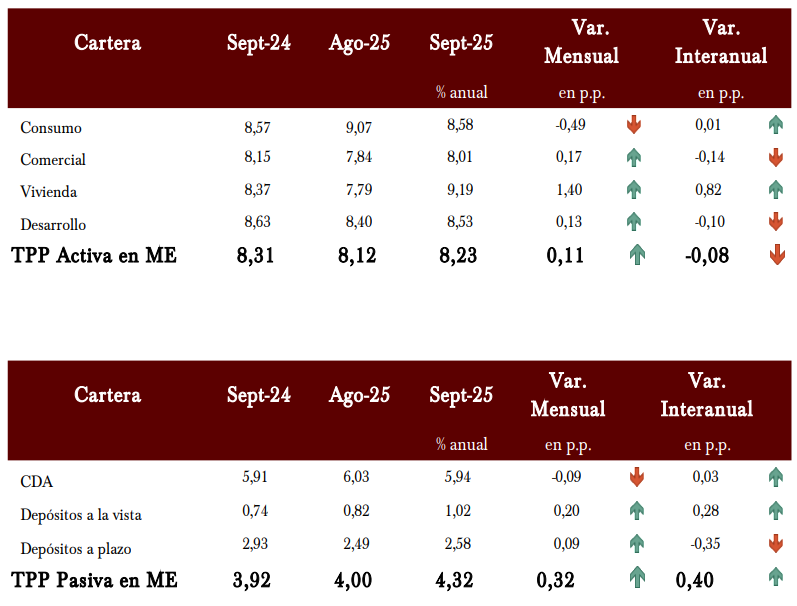 En el caso de las tasas de interés pasivas, el informe de la banca matriz destaca que el promedio ponderado en ME aumentó tanto con respecto al mes anterior (0,32 pp) como en comparación con septiembre de 2024, en 0,40 pp.