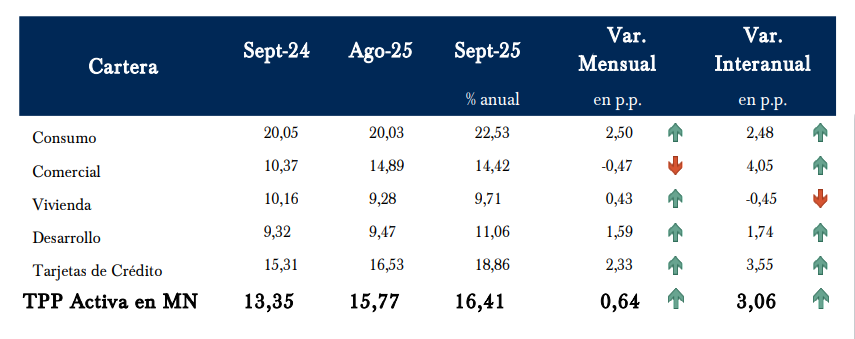 En septiembre de 2025, la tasa de interés promedio en moneda nacional para los préstamos de consumo fue del 22,53%, con un aumento mensual de 2,50 pp y una variación interanual de 2,48 pp respecto al mismo mes del año anterior.
