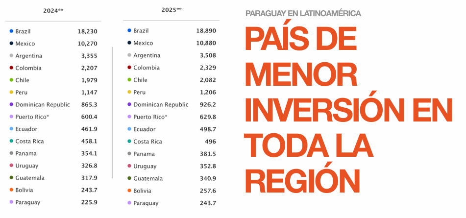 En referencia a la posición de la inversión publicitaria en Paraguay respecto a otros países de América Latina y el Caribe, el informe destaca que nuestro país mantiene su lugar como el de menor inversión en toda la región.