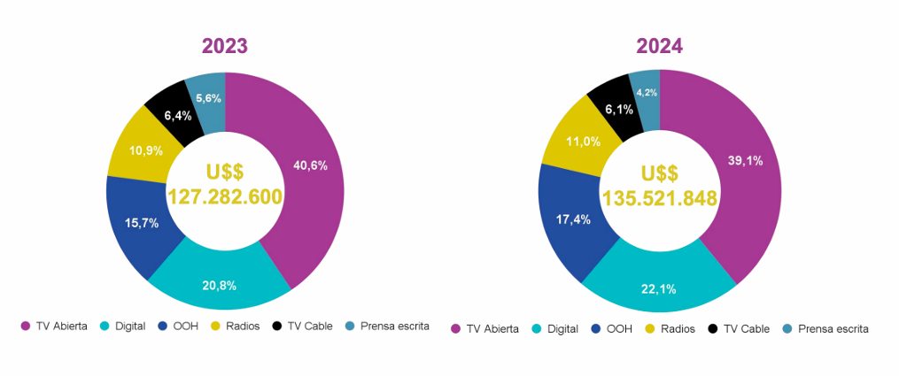En relación a la inversión total en medios, Apap destaca que la industria alcanzó un total de USD 135,5 millones en el año 2024, lo que representó un crecimiento interanual de 6,5% respecto al año anterior, cuando se había situado en USD 127,2 millones.