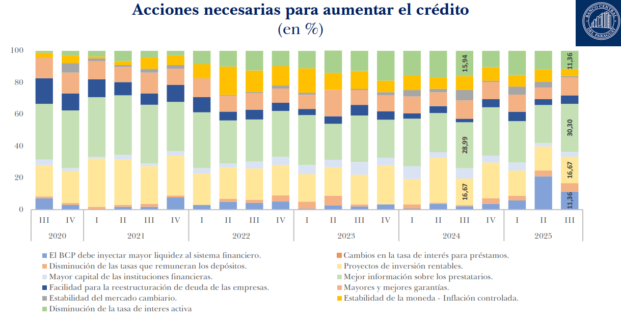 El Banco Central del Paraguay (BCP) publicó los resultados de la encuesta de Situación General del Crédito correspondiente al tercer trimestre. El informe destaca que, en un contexto macroeconómico favorable, el crédito bancario sigue mostrando signos de expansión, aunque existen factores que podrían ajustarse para potenciar su crecimiento o mantener la dinámica actual.