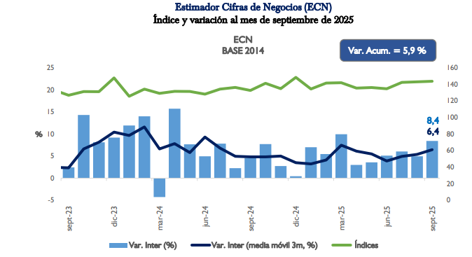 De acuerdo con datos preliminares del Estimador de Cifras de Negocios (ECN), en septiembre de 2025 la variación interanual alcanzó 8,4%, mientras que la acumulada al cierre del tercer trimestre se situó en 5,9%. El promedio móvil de tres meses registró un incremento interanual de 6,4%, impulsado principalmente por la evolución positiva de los sectores de servicios, manufacturas y comercio.